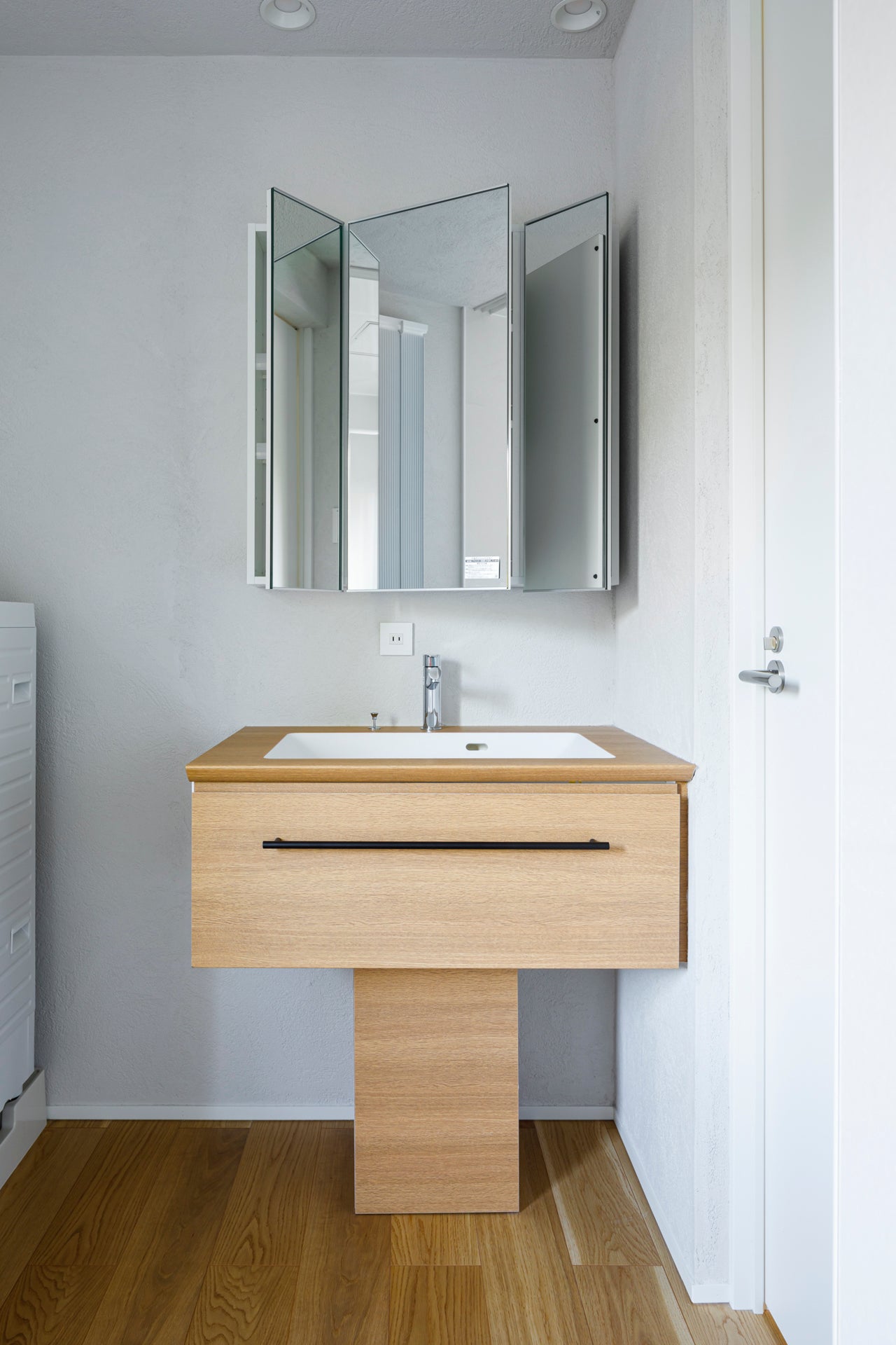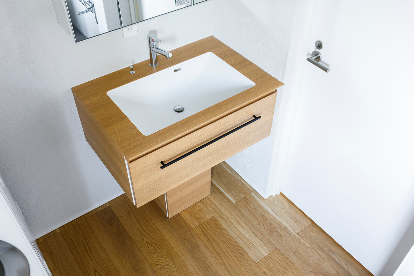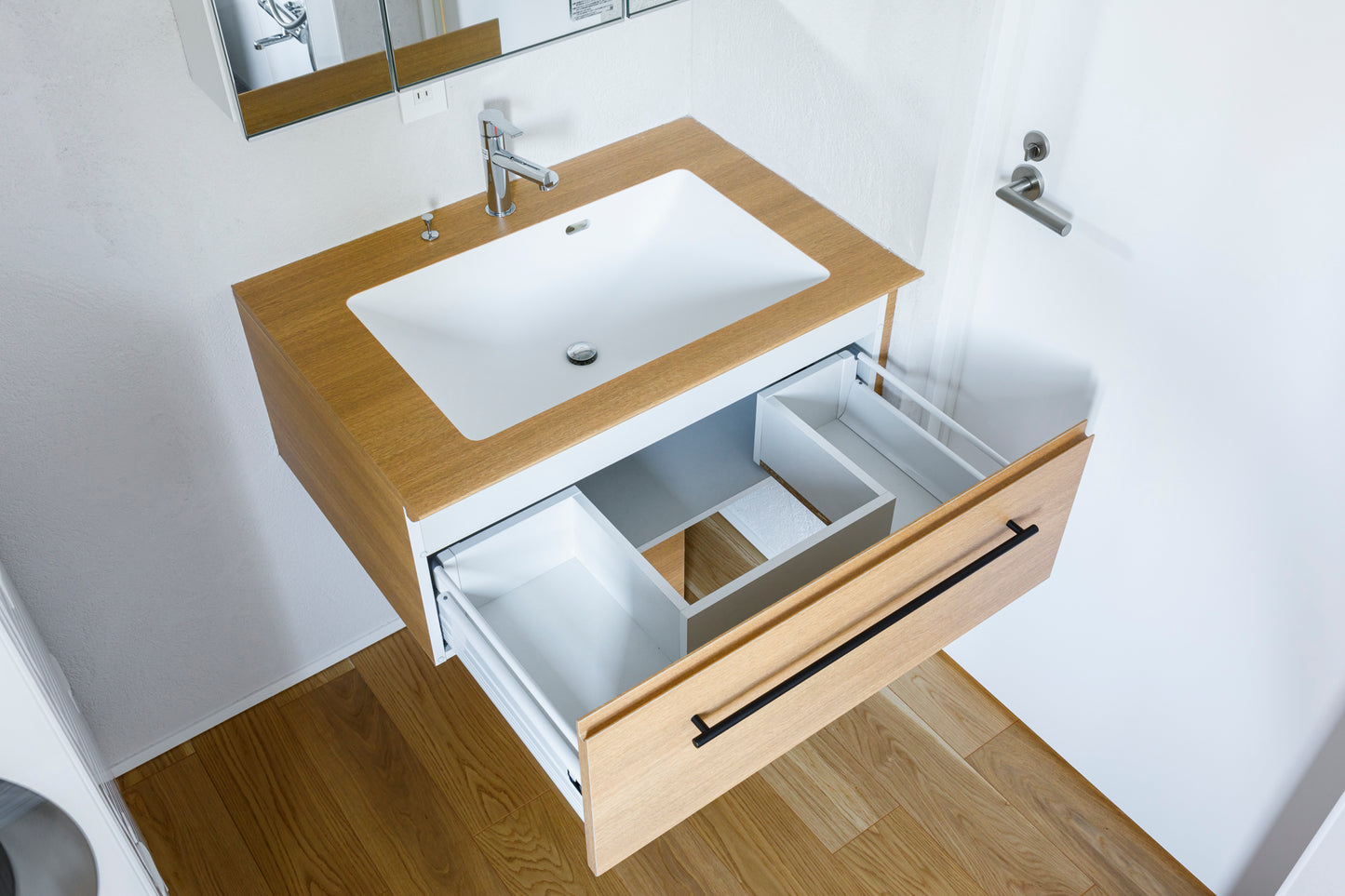 A hotel-like design with a stylish presence and a warm wood-grain finish. Perfect for leisurely makeup routines or at-home spa treatments after a bath. At 85cm high—a height not offered by standard manufacturers—it allows for comfortable use without having to bend over.