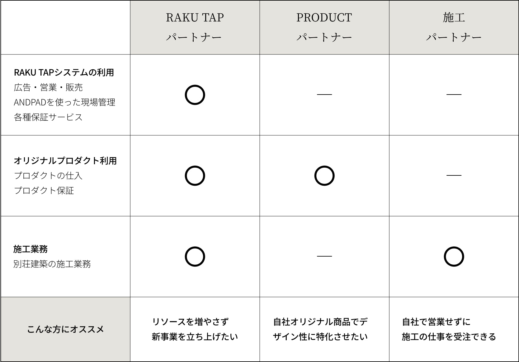 RAKU TAPパートナーイニシャル:加盟時一回100万円(税抜)ランニング10万円(税抜)/月額