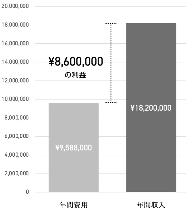 仮に貸別荘としての年間稼働率を50%とします。土地+建物を90,000,000円で購入した別荘で、平均宿泊単価を100,000円として貸別荘として運用した時に、年間(365日別荘運用した場合)での売上想定額は約18,200,000円です。別荘の年間の掛かる費用を差し引くと年間の収益総定額は約8,600,000円です。(固定資産税や火災保険等は別途)