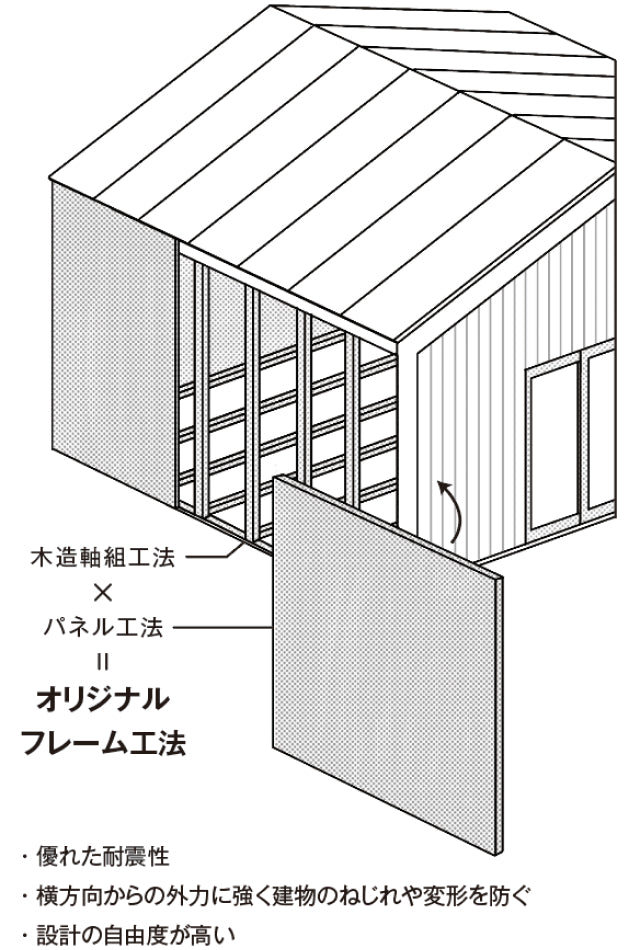 it's HOUSEは「オリジナルフレーム工法」を採用しています。柱と梁で支える「木造軸組工法」と床、壁、天井といった面で支える「パネル工法」を組み合わせた工法です。この工法で耐震等級3を確保しつつ、開放的で自由度の高い空間をデザインすることが可能です。