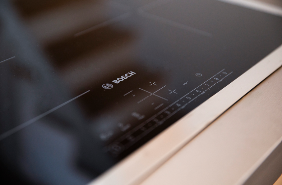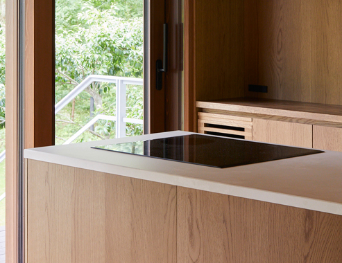 い勝手を考えた4口コンロ 「家具のようなキッチン」をコンセプトに、見た目も美しい一体感のあるデザインにするため、現代のライフスタイルではあまり利用されない魚焼きグリルを思い切ってなくしました。その代わり、お手入れがしやすいガラスセラミックをトッププレート(天板)に使った4口コンロを採用。15段階の加熱レベル設定に加えて、揚げ物に便利な14段階の温度設定機能も搭載しています。ディスプレイには3段階の余熱インジケーターが表示され、表面温度の安全管理を行うほか、お子さまが誤って使用するのを防ぐチャイルドロック機能も付いているので、家族全員が安心して使えます。