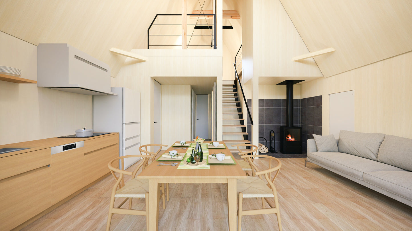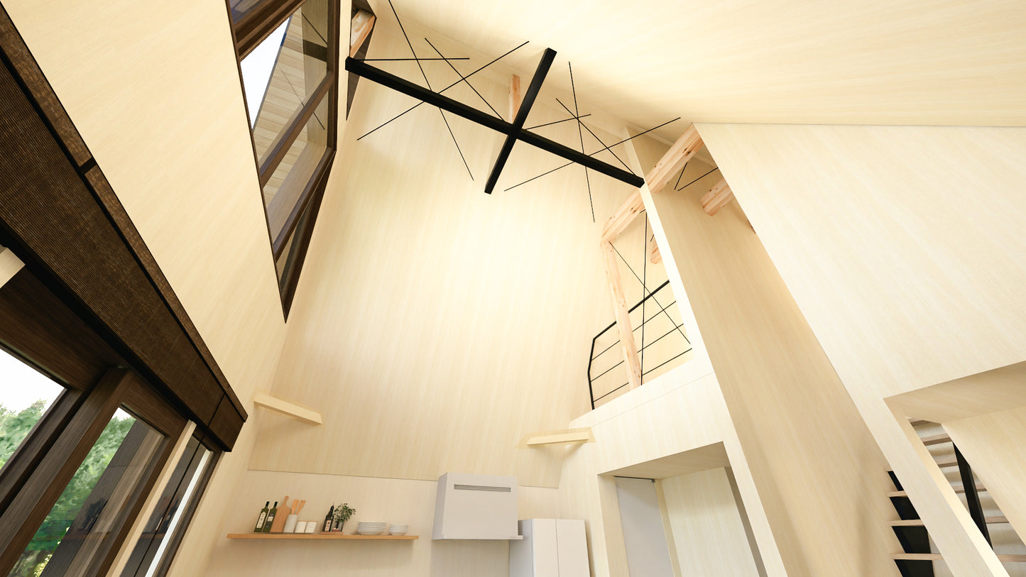 高さ7.2mの大空間には三角窓から燦々と光が降りそそぎ、リラックス効果抜群。夜には暖炉の前で趣味の時間を過ごしたり、三角窓から星空を眺めることもできます。