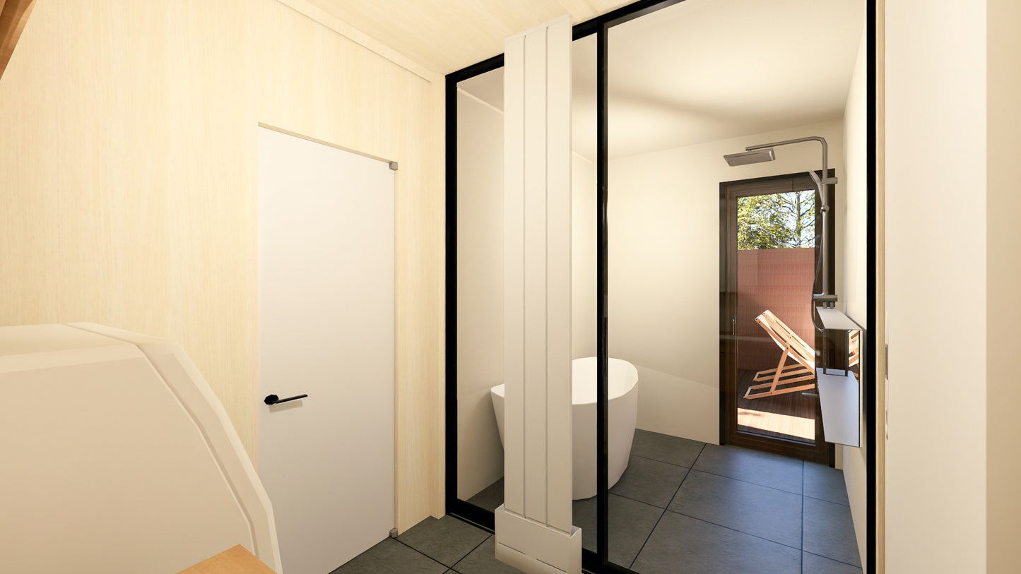 シャープなルーフラインが印象的で、洗練された外観が非日常を演出します。 明るい室内はホテルのように上質で、吹抜けの広々リビングと2つの寝室でゆったりお過ごしいただけます。