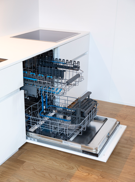 海外製の大型フロントオープン式食洗機を標準装備。 国産モデルより約15cm深く、最大12人分の食器を一度に洗浄可能です。 鍋や大皿もラクにセットでき、予洗い不要で汚れをしっかり落とします。 さらに、節水効果も高く、家計にも環境にも優しい設計です。