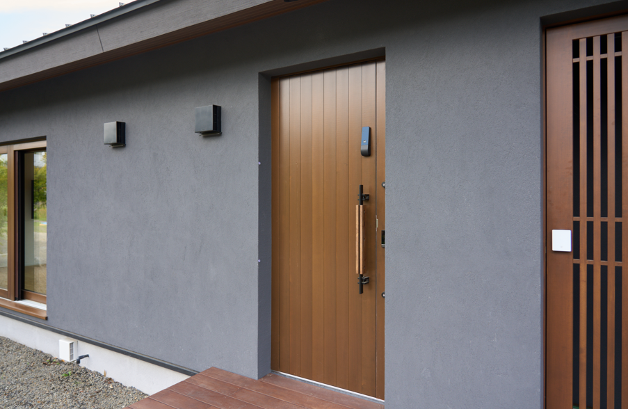 重厚感のある木製玄関ドアと特徴的なアイアン調のハンドルが、住まいにエレガントで洗練された雰囲気をもたらします。スマートキーが装備されており、便利さとともに高い防犯性能を提供します。