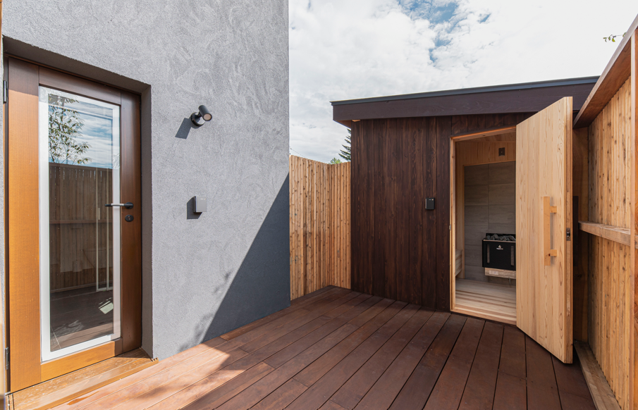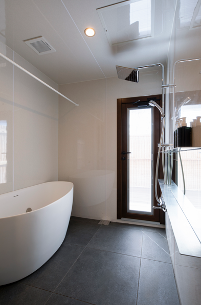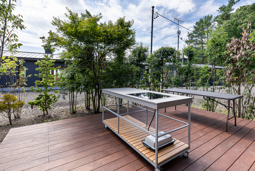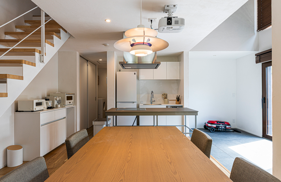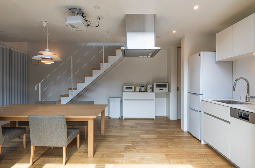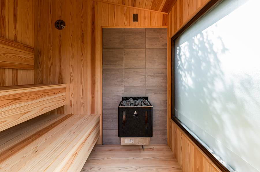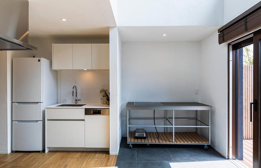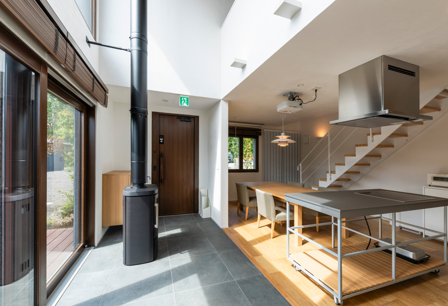 - * 光を感じ、リビングと、土間と、吹抜けを介し2階とつながる。 家の中心にキッチンのある間取りです。フィンランド式サウナ付きです。
