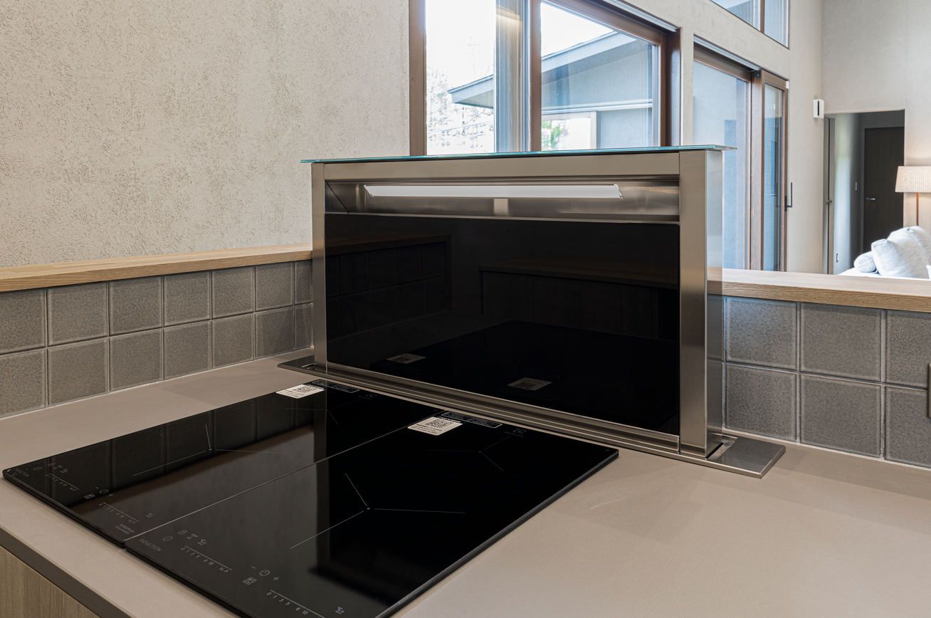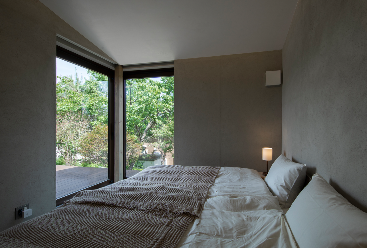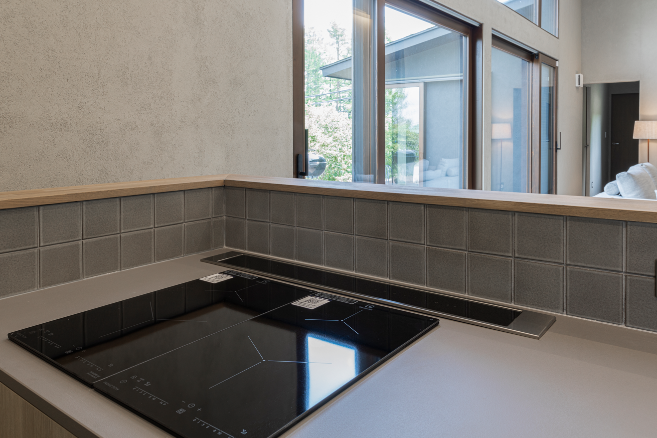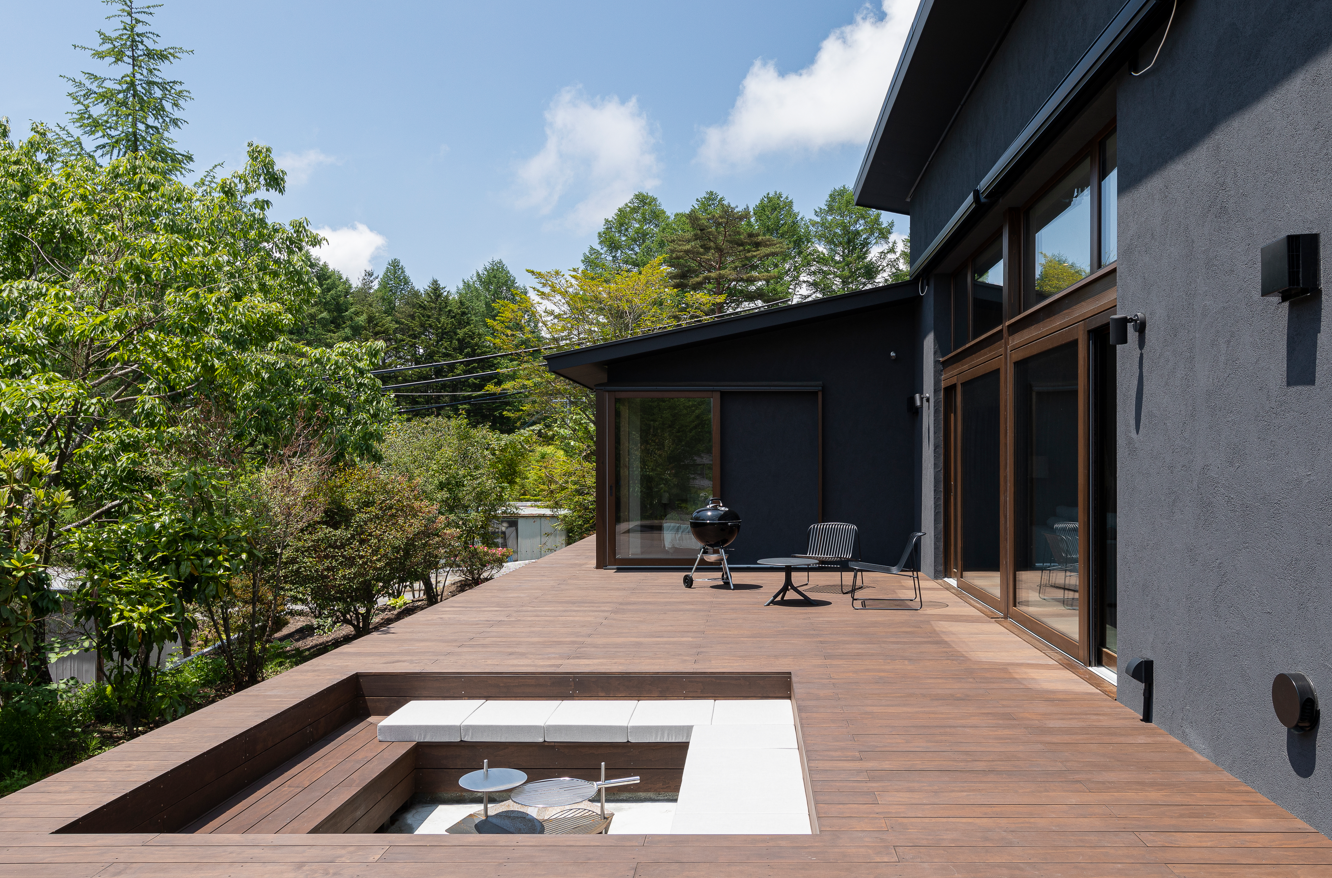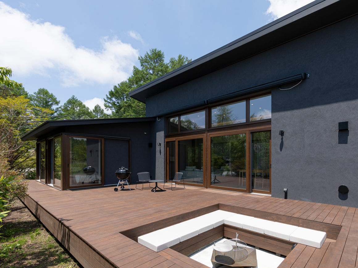 「うち」と「そと」2つのLDK。 天高3.7m、外部の環境を受け止めるように広がるLDKは 都会では味わえない開放感を与えてくれる。 パブリックなLDKとプライベートな個室をずらすことで 適度な距離感が生まれ、様々なライフスタイルに応えることができる。LDKの窓を開放すれば、内部とテラス、そして豊かな自然がレイヤー上になり、そこには倍の面積になったLDKが生まれる。10名程度で使用できるテラスのファイヤーピットは 都会ではなかなか味わえないアウトドアリビングを演出し 軽井沢の自然の中での体験をより豊かなものにしてくれます。