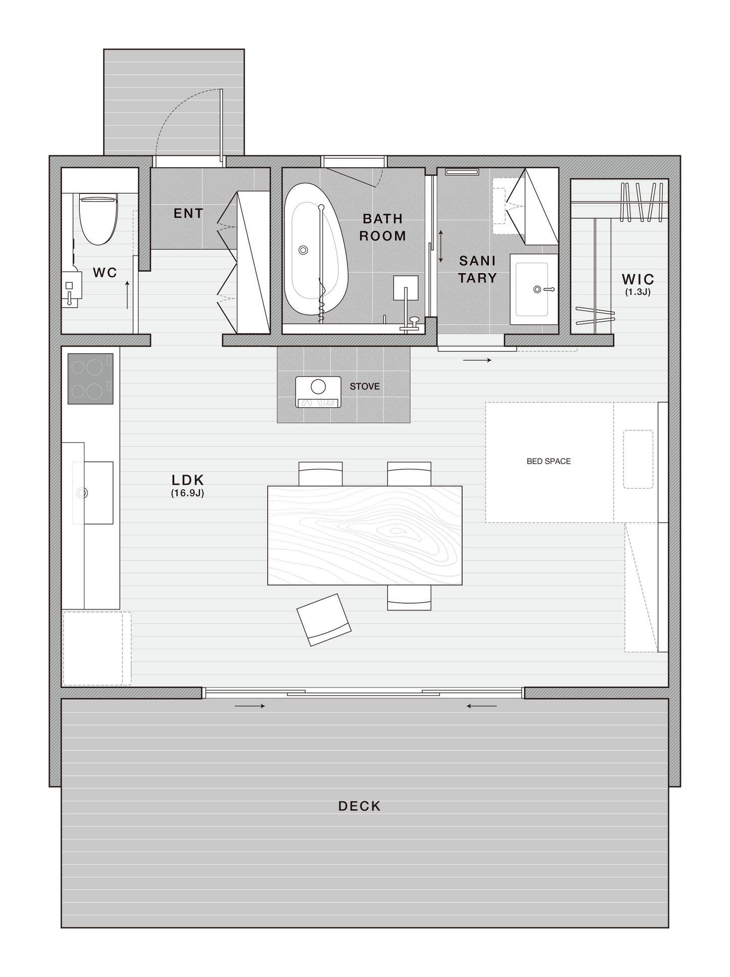 ミニマルだからこそ手が届くを快適さを追求し、42㎡ワンルームでありながら大きな窓と勾配天井にて広がりのある贅沢な空間を演出。