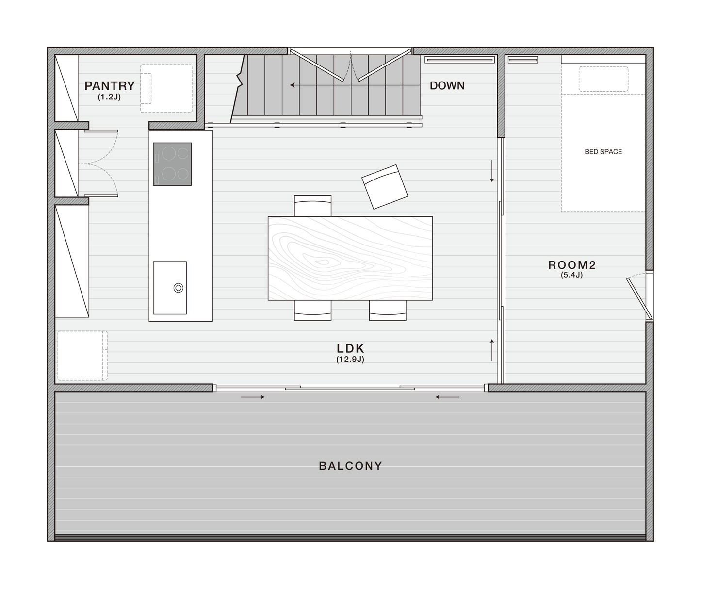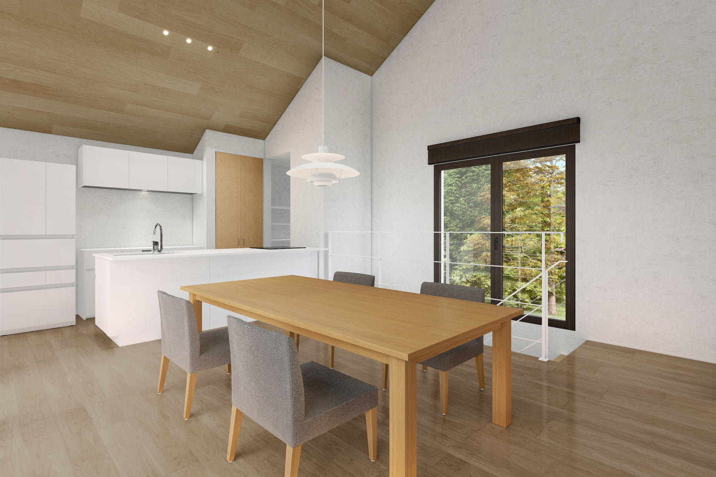 1階リビングではなく、贅沢な眺望を望める2階をリビングダイニングにしたプラン。勾配天井と大きな窓がより解放感のある空間へと演出しています。リビングから床をフラットに繋げた奥行2mの屋根付きバルコニーは、日差しだけでなく雨も遮り、梅雨時期でも、お子様との時間、ご友人とのパーティー、ちょっと一息できるカフェタイムなど、解放感あるバルコニーを使用できるように設計いたしました。