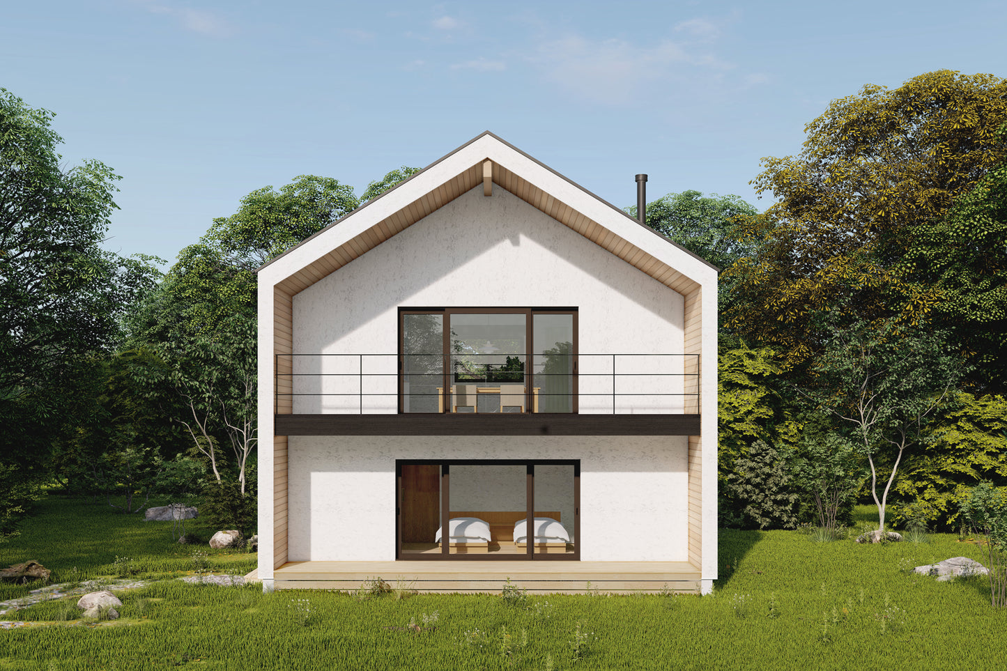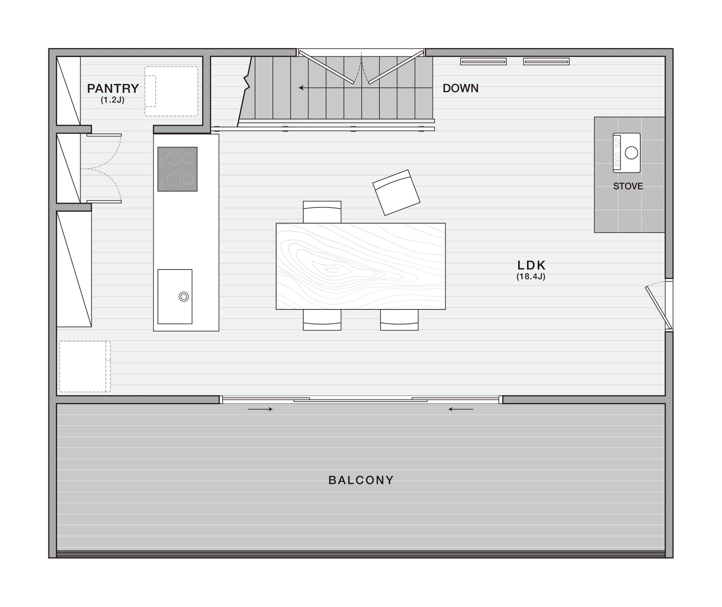 1階リビングではなく、贅沢な眺望を望める2階をリビングダイニングにしたプラン。勾配天井と大きな窓がより解放感のある空間へと演出しています。リビングから床をフラットに繋げた奥行2mの屋根付きバルコニーは、日差しだけでなく雨も遮り、梅雨時期でも、お子様との時間、ご友人とのパーティー、ちょっと一息できるカフェタイムなど、解放感あるバルコニーを使用できるように設計いたしました。