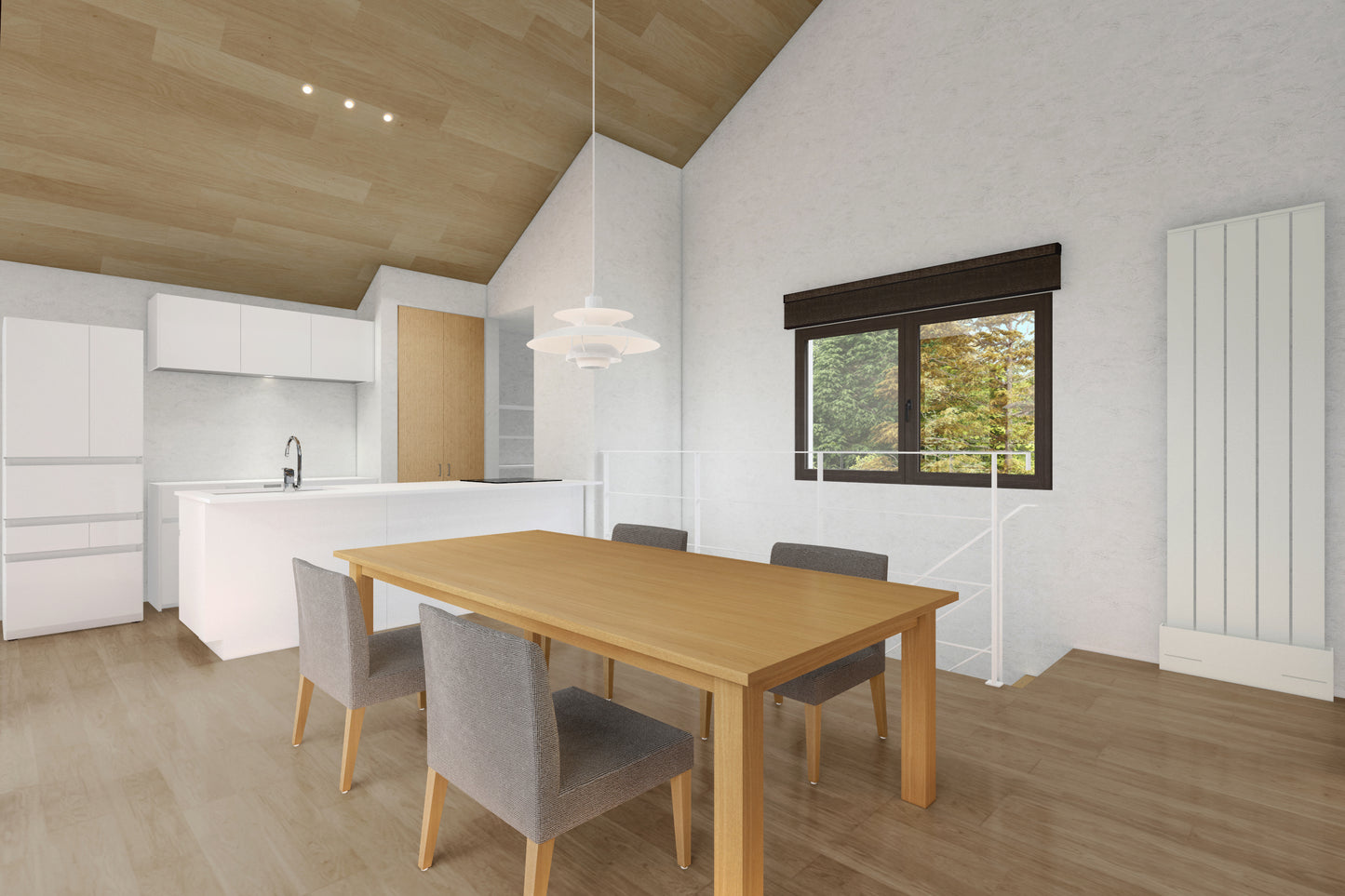 2階のLDKから豊かな眺望を愉しむ。大きな窓と勾配天井で、開放感はたっぷり。 屋根付きバルコニーはパーティーにも、お子様の遊び場にも、日常のお洗濯にも。