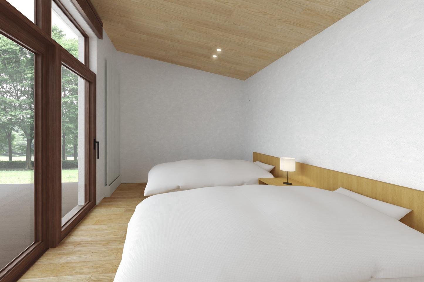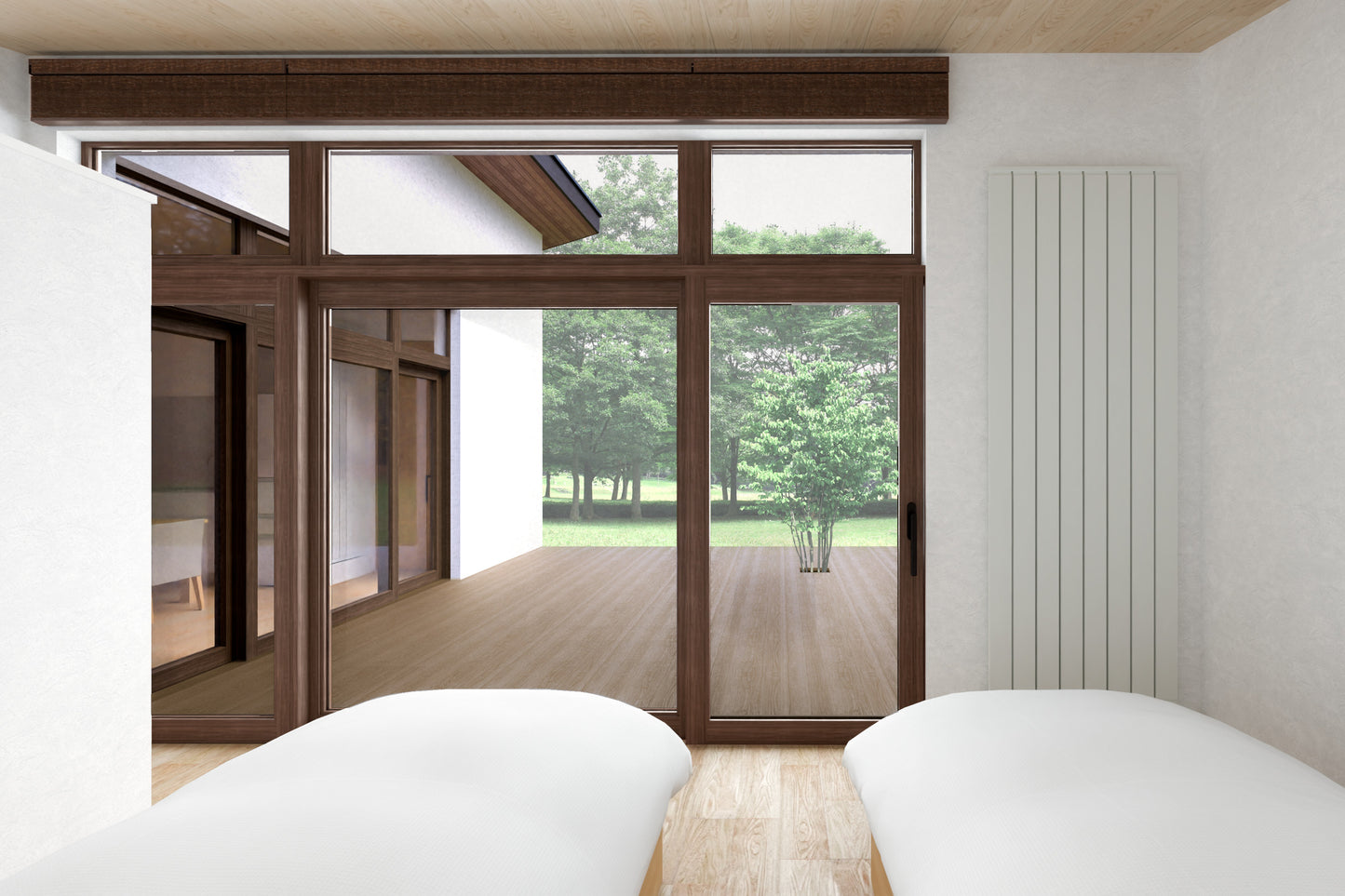 L型の間取りにすることにより、ウッドデッキを中心にリビングとベッドルームは室内外どちらからも行き来できるプライベートな空間を作りました。