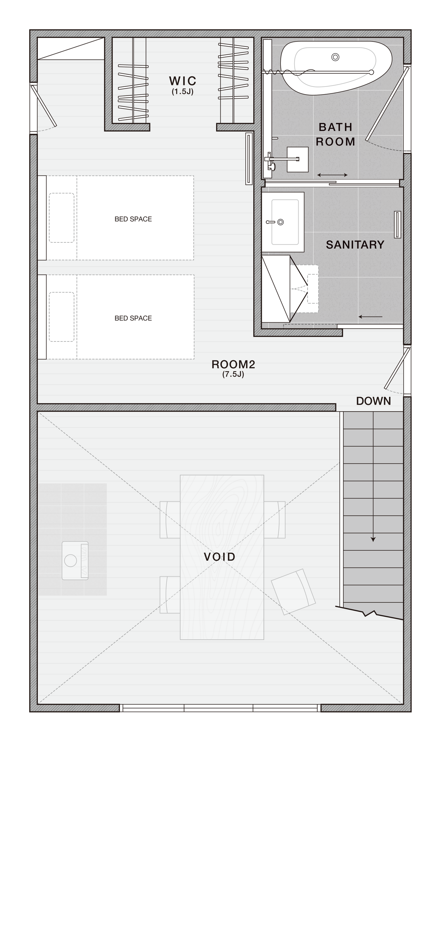 吹抜けから緩くつながる2階の寝室やバスルームはプライベートを確保しながらも、リビングと時間を共有できます。