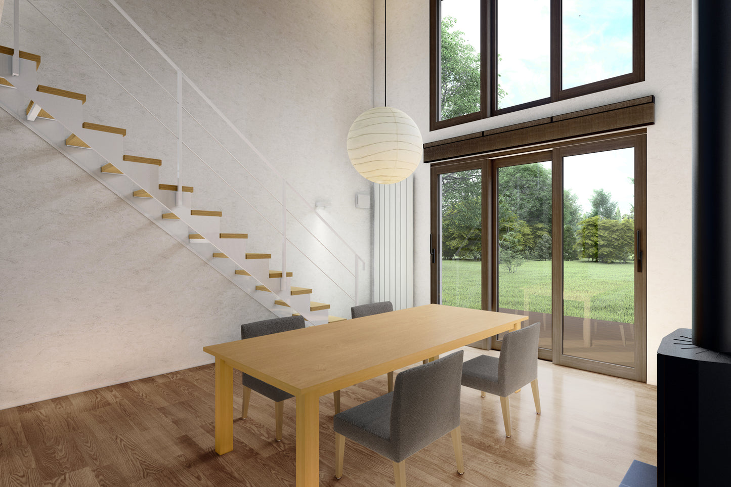 大きな吹抜けのリビング空間は、大開口窓が自然光を取り入れ開放感のある空間を演出します。 明るく広々としたLDKに家族が集い、生活のオンとオフが容易に切り替えられる機能性と安らげる空間の両立を実現しました。。