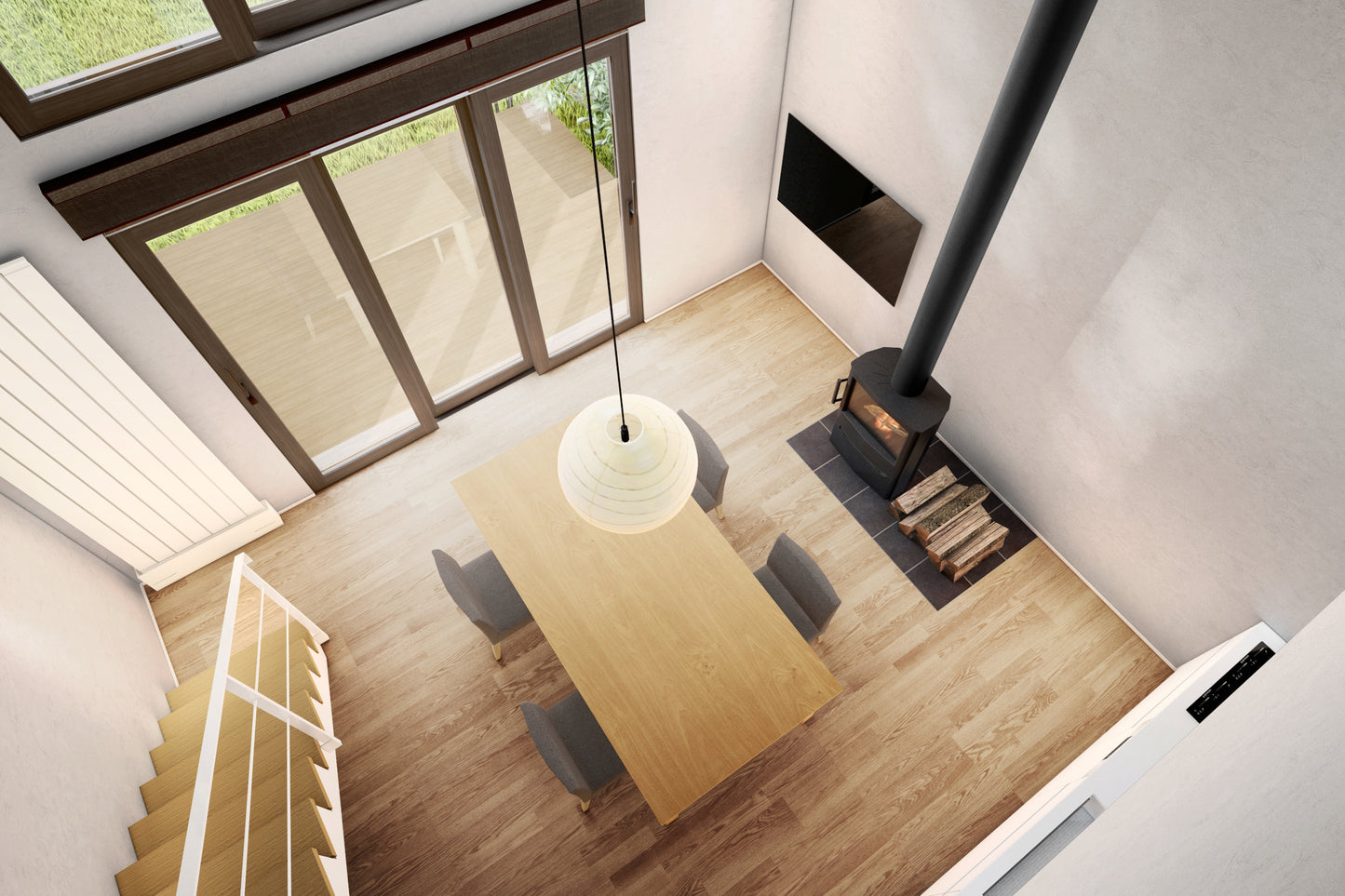 大きな吹抜けと勾配天井が特徴のリビングは、大開口窓が自然光を取り入れ開放感のある空間を演出します。
