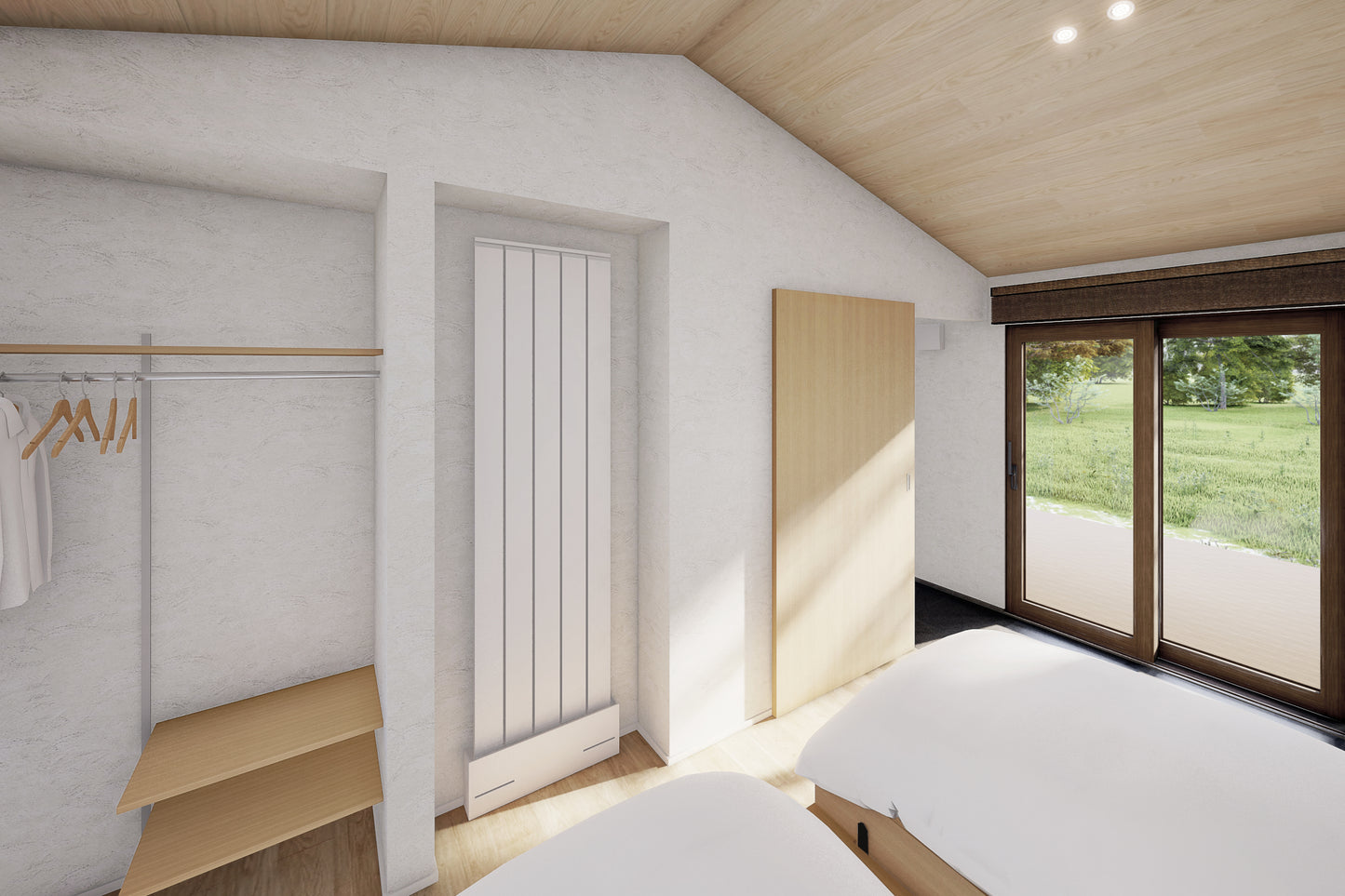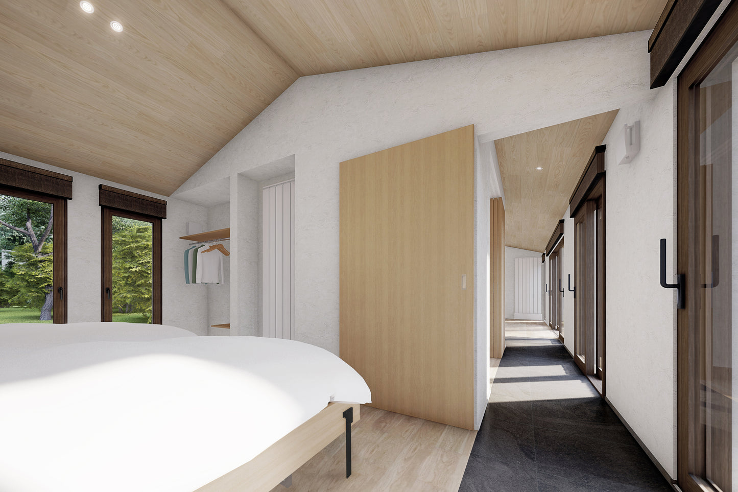 寝室にのびてゆく土間はどこか縁側の雰囲気を醸し出し、寝室に設えた木目のオープンクローゼットは、あえて“魅せる”収納に。