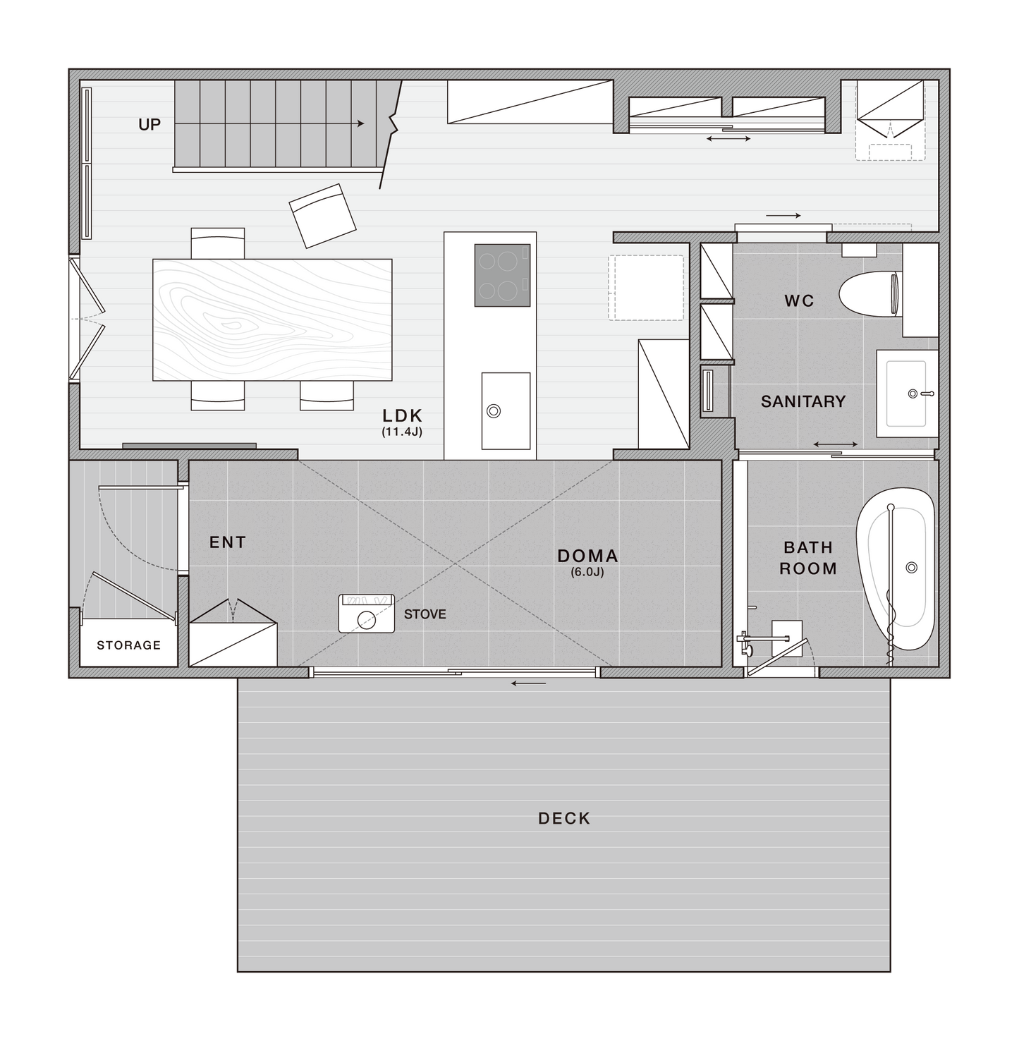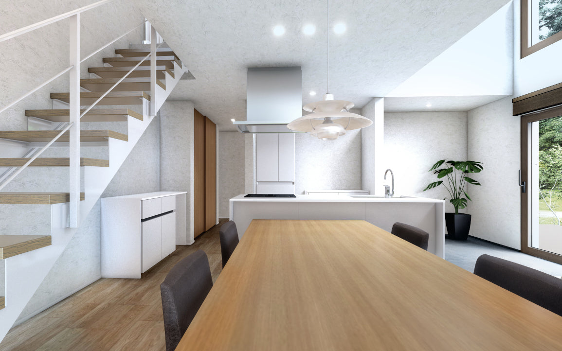 料理をするためだけのキッチンじゃない、キッチンが生活のスパイスになる。 光を感じ、リビングと、土間と、吹抜けを介し2階とつながる。 家の中心にキッチンのある間取りです。
